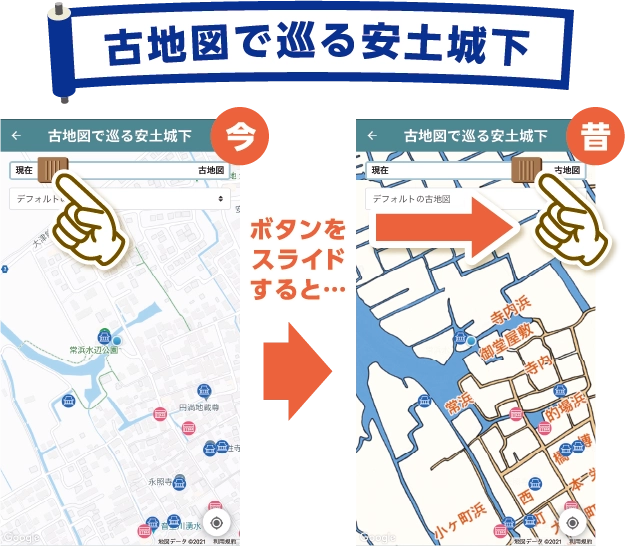 今自分が歩いている場所が、昔はどのような地図になっていたのかが一目瞭然!当時の風景に思いを馳せることができます。